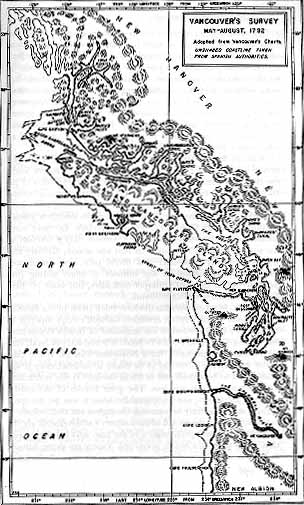 Later that evening he made camp for the night somewhere near the junction of Burrard Inlet and the North Arm, now called Indian Arm, just south of Belcarra on the opposite shore. Landing at low tide on “shores formed by steep rocky cliff that afforded no convenient place for pitching our tent”, they further entertained the Salish: “A great desire was manifested by these people to imitate our actions, especially in firing of a musket, which one of them performed, though with much fear and trembling.” Eventually, after a great deal of sign language, and gifts of “acceptable articles”, Vancouver persuaded his guests to leave. Thus the natives were, fortunately, not present to witness the shambles created on that rocky shore when the tide came in. Those who had not had the foresight to sleep in the boats: At four in the morning of Thursday, June 14, Vancouver began his return journey. Looking north he noted and quickly dismissed: